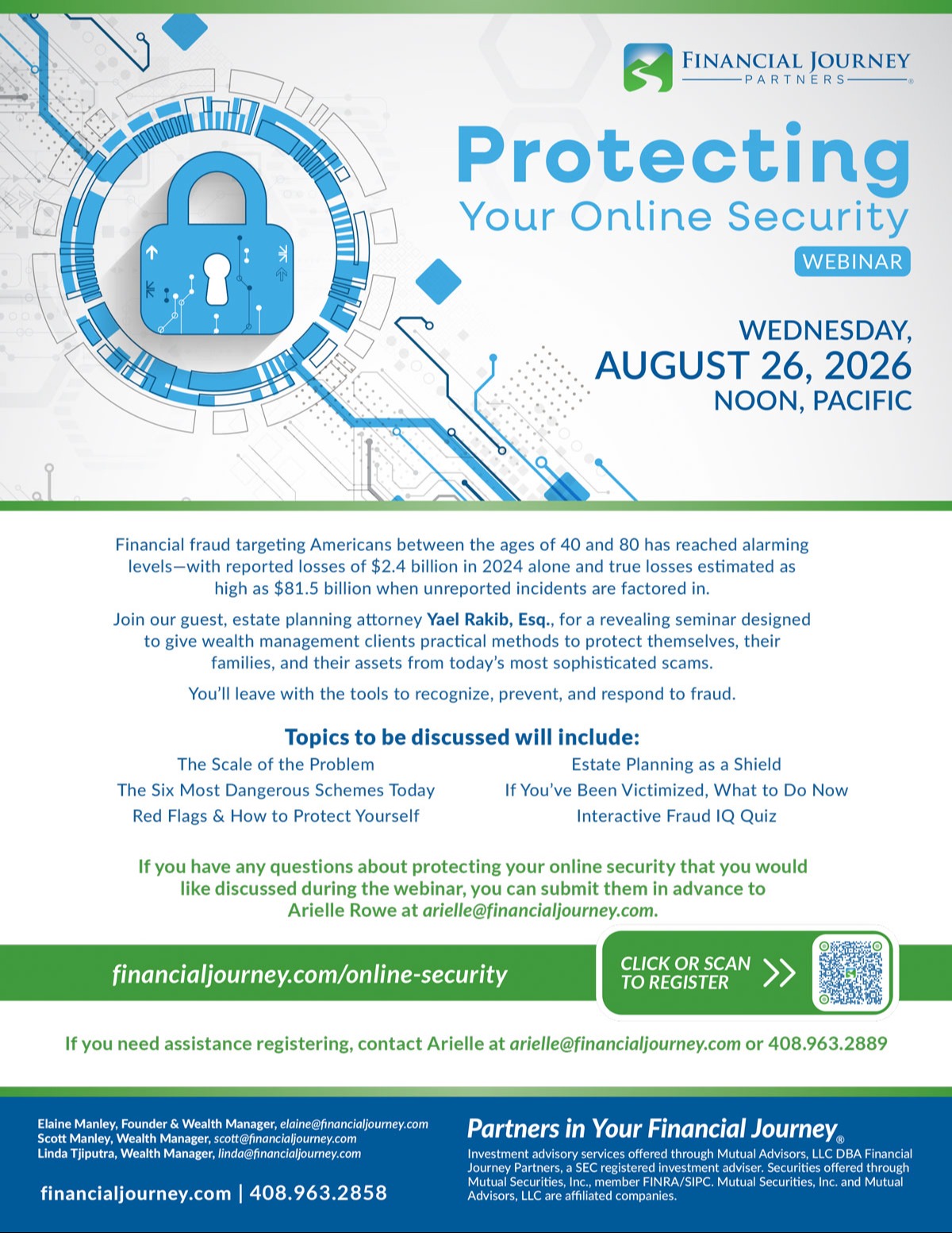 Financial fraud targeting Americans between the ages of 40 and 80 has reached alarming levels-with reported losses of $2.4 billion in 2024 alone and true losses estimated as high as $81.5 billion when unreported incidents are factored in. Join our guest, estate planning attorney Yael Rakib, Esq., for a revealing seminar designed to give wealth management clients practical methods to protect themselves, their families and their assets from today's most sophisticated scams.